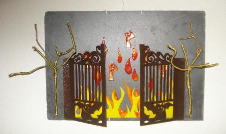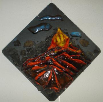 Emaille op koper, messing draad, Handen waar 'bloed' aan zit, verbranden in het vuur | Eruption, 30 x 30 x 4 cm, Emaille op koper met vulcanisch materiaal op leisteen |