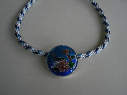 Emaille op koper met zilveren gebogen accent | Waterlelie, cloisonné op zilver aan satijnen handgeweven Kumihimo koord (Kumihimo weef techniek) |